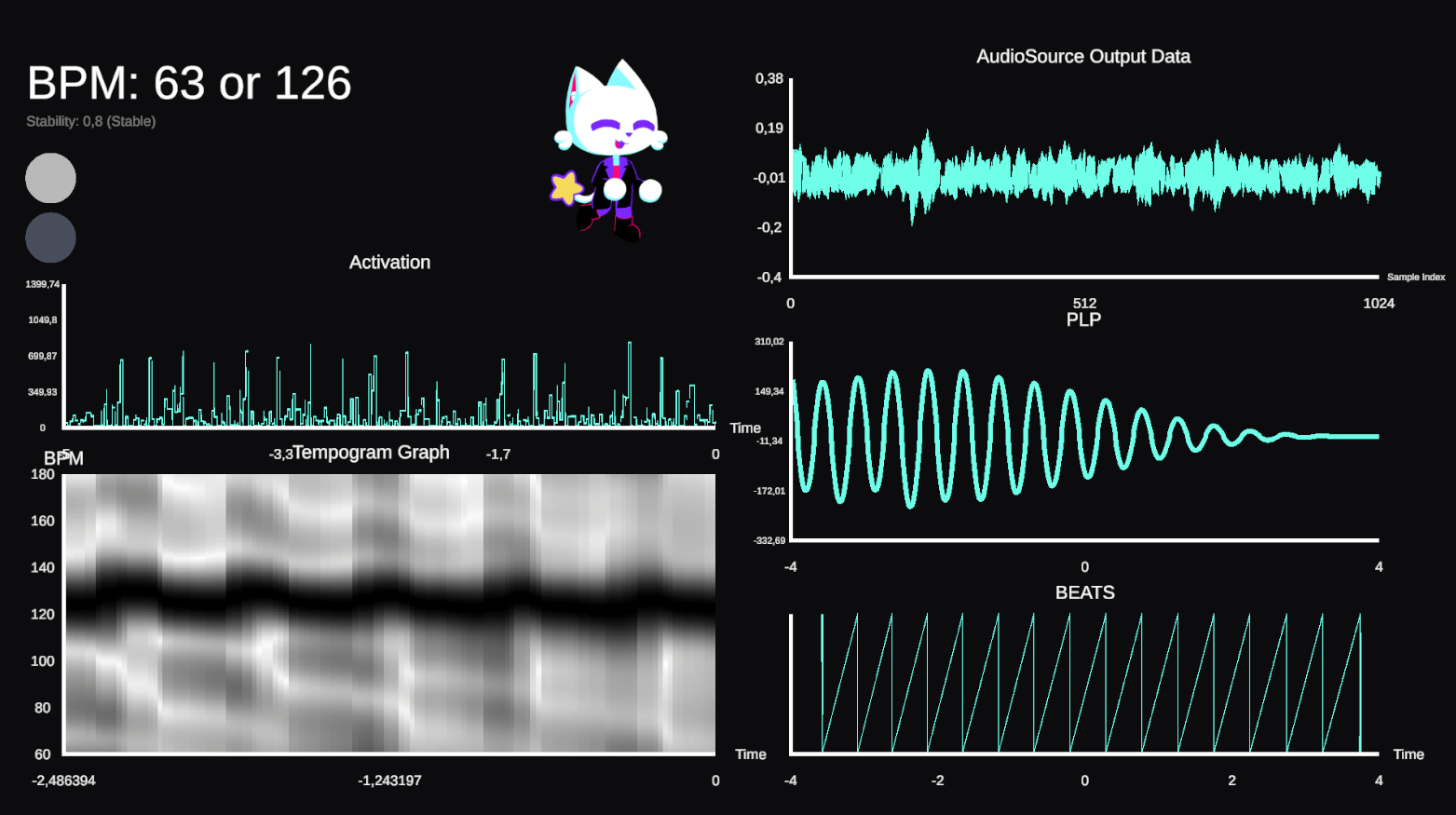 1. PLP Visualization: It's the main visualization mode that shows the AudioData graph, the activation, the tempogram, and finally, the PLP graph. It also has a funny cat clapping his hands along beats with a stability greater than a certain threshold.